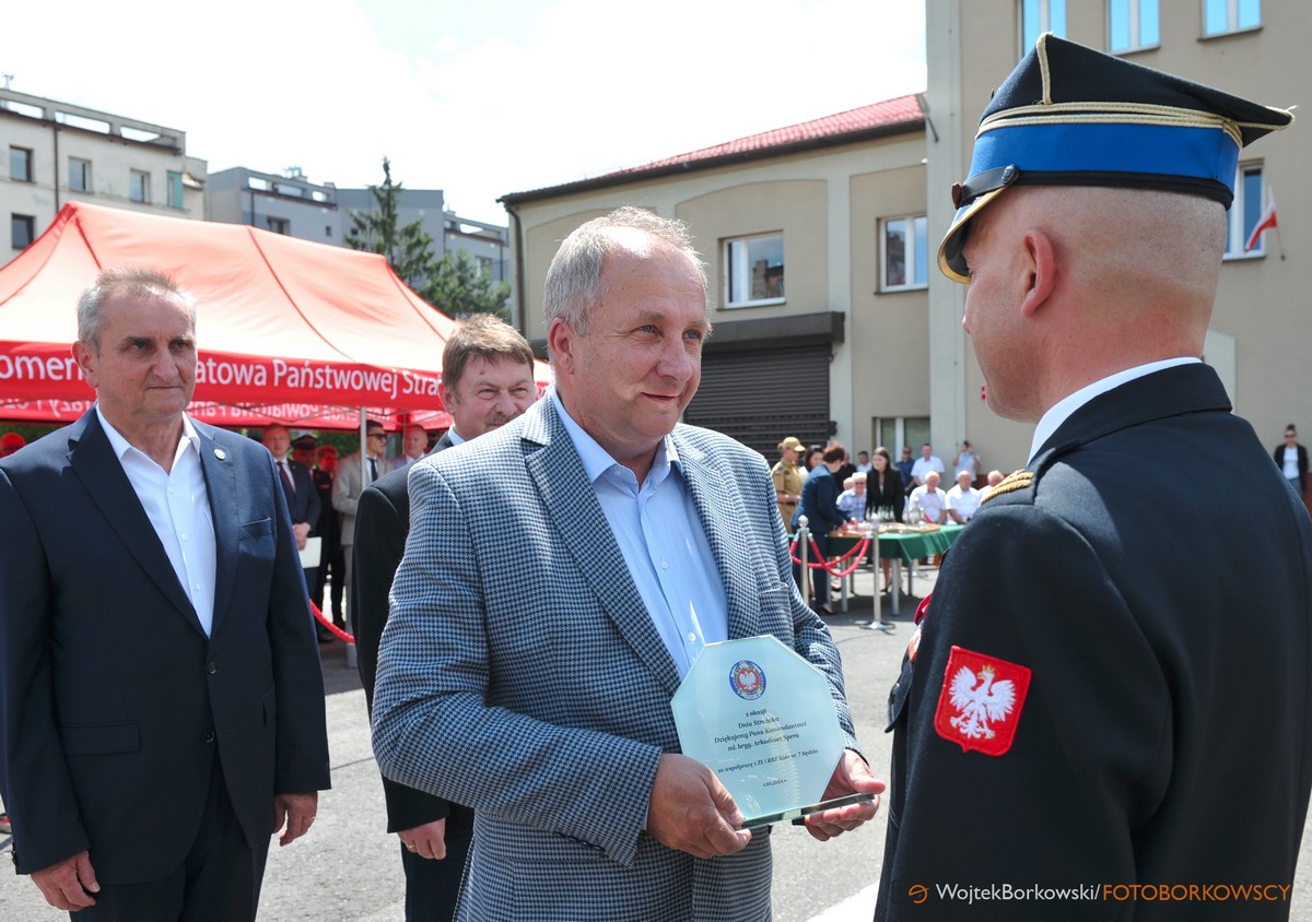 Bardzo miłym akcentem było wręczenie Komendantowi Powiatowemu PSP mł. bryg. Arkadiuszowi Spera odznaki ,, Zasłużony dla Związku Emerytów i Rencistów Pożarnictwa RP’’ oraz okolicznościową statuetkę przez Prezesa Oddziału Wojewódzkiego w Katowicach Romana Szłapę w asyście Prezesa Koła Janusza Gregorczyka oraz członka Koła kol. Grzegorz Tkaczyka.