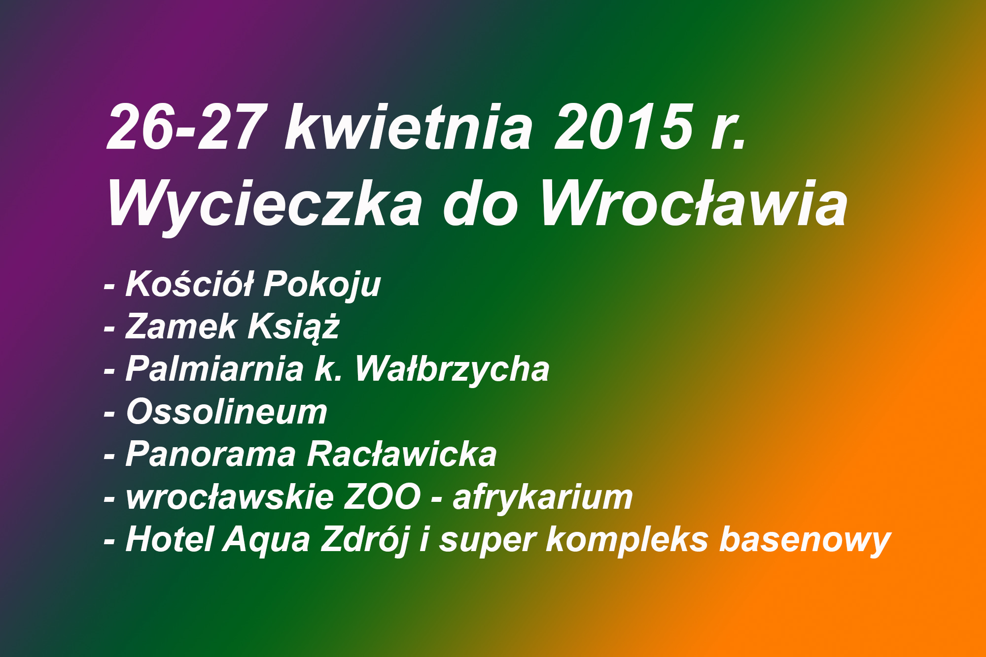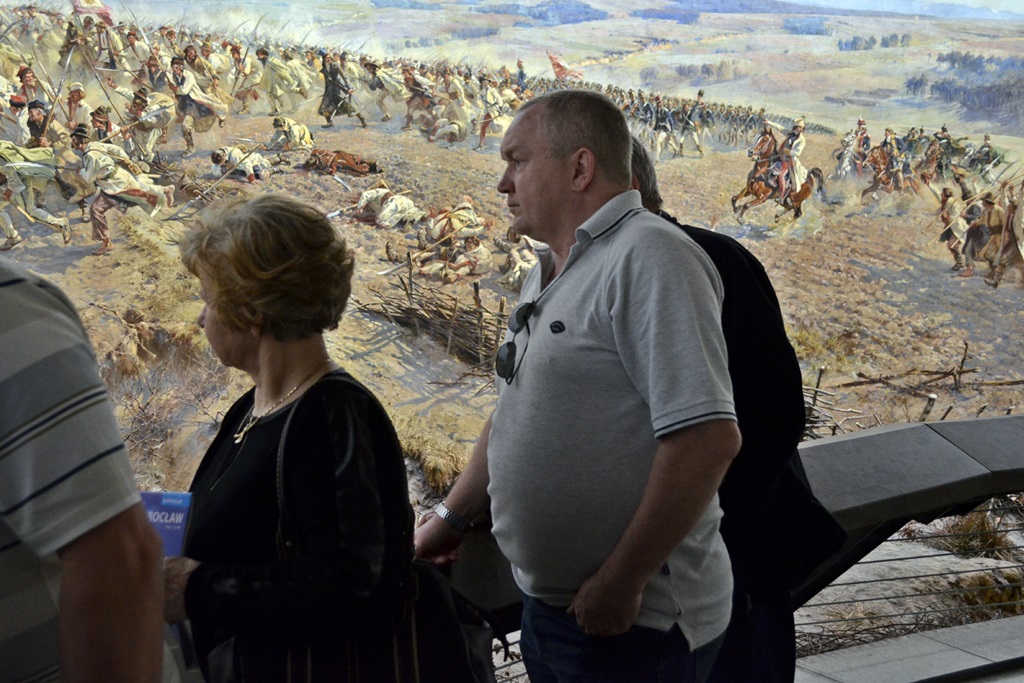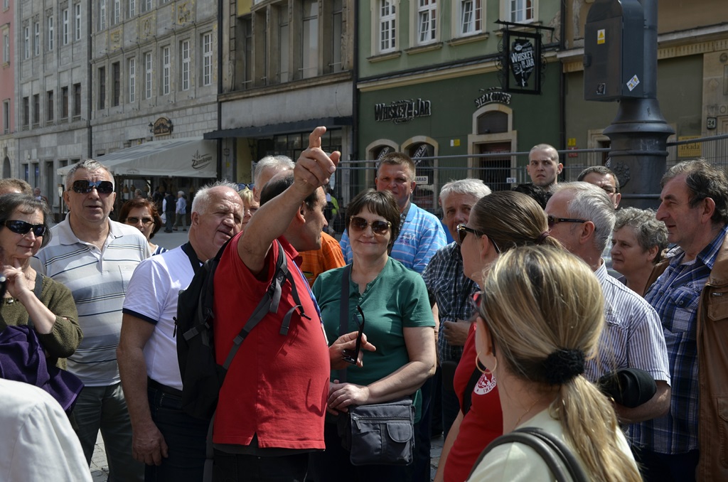 Zgodnie z programem, 26-27 kwietnia 2015 r. zgrana grupa naszych emerytów wraz z osobami towarzyszącymi udała się na planowaną wycieczkę do Wrocławia. Po drodze odwiedzono miejscowość Świdnica, a tam Kościół Pokoju oraz malowniczą świdnicką starówkę. Kolejnym punktem programu był znany zamek Książ nieopodal Wałbrzycha. Spędziliśmy tam ponad 2 godziny zwiedzając komnaty zamkowe, podziemia, ogrody, słuchając zajmujących opowieści pani przewodnik, z którą kolega Krzysztof (bo to już tradycja) nie omieszkał się sfotografować. Zwiedziliśmy również przepiękną palmiarnię w Wałbrzychu. Nasi emeryci zostali zakwaterowani w hotelu Aqua Zdrój z wszystkimi przysługującymi emerytom wygodami i pełnym wyżywieniem. Atrakcją hotelu był kompleks basenowy, z którego korzystaliśmy tuż po zakwaterowaniu, a także o poranku dnia następnego (po wieczorku zapoznawczo-pożegnalnym mającym miejsce wieczorem dnia poprzedniego). Po (jak to obecnie określa młodzież) „wypasionym” śniadaniu w komplecie wyruszyliśmy do Wrocławia. Pogoda jak marzenie! W tym pięknym mieście pod przewodnictwem miejscowego przewodnika zwiedziliśmy starówkę z malowniczym rynkiem, ratusz, Ossolineum, obejrzeliśmy wspaniałe dzieło Kossaka i Styki „Panoramę Racławicką”. Spożyliśmy pyszny i obfity obiad, a po nim mieliśmy do dyspozycji ponad 3 godziny we wrocławskim ZOO, gdzie spędzaliśmy miło czas obserwując zwierzęta. Nowością wrocławskiego ogrodu zoologicznego jest afrykarium, wydzielona część ogrodu, gdzie można podziwiać gady, płazy, ryby i zwierzaki rodem z Afryki. Niezapomniane wrażenia. Kto nie był, powinien to zobaczyć! Nasza wycieczka jak zwykle… była niezwykle udana. „Nowa” Pani pilot-przewodnik Kasia, bardzo interesująco opowiadała o mijanych podczas jazdy miejscach. Kierowca Przemek spisał się na medal. No i wreszcie mili, sympatyczni i uśmiechnięci uczestnicy wycieczki jak zwykle bez zarzutu. Punktualność i strażacka dyscyplina to wizytówka naszej grupy emerytów i rencistów PSP z Bielska-Białej. (Jak to mówią: „punktualność i alkohol, trzeba mieć we krwi”)
