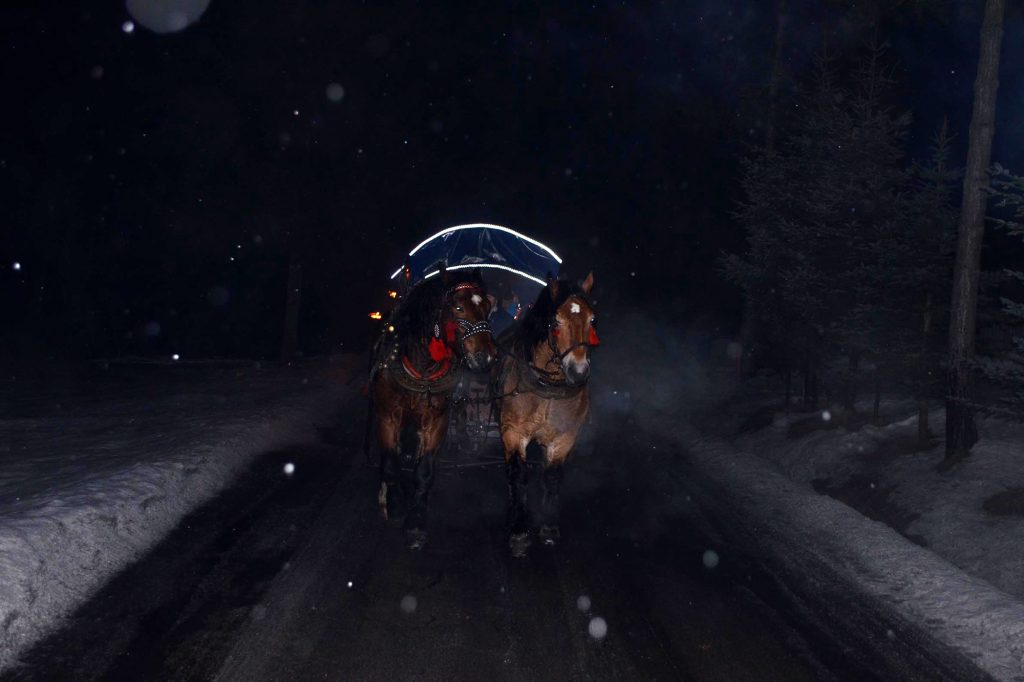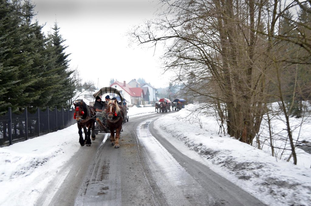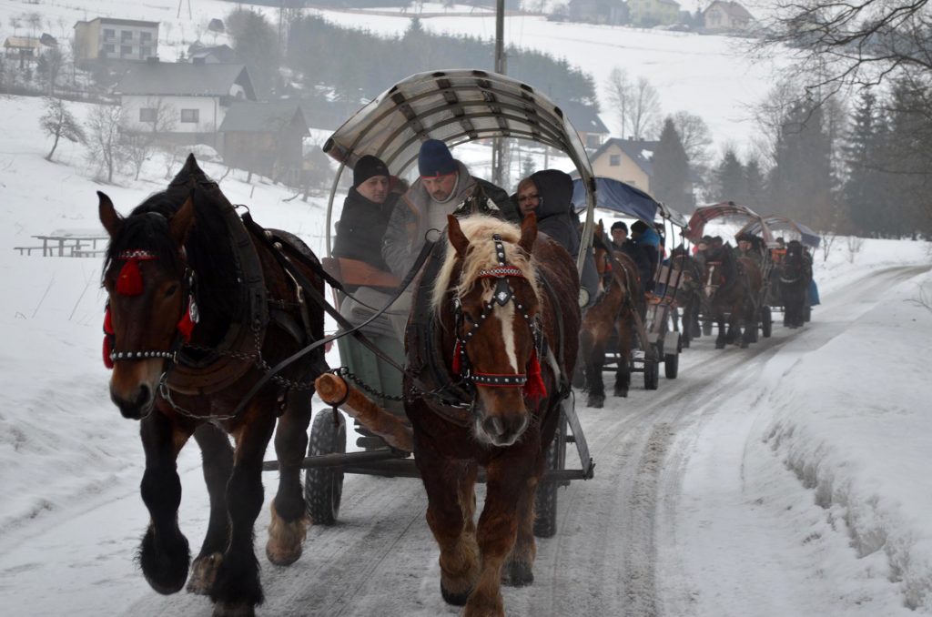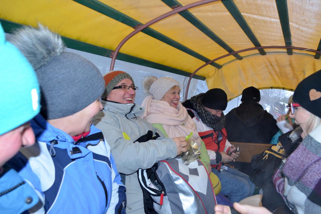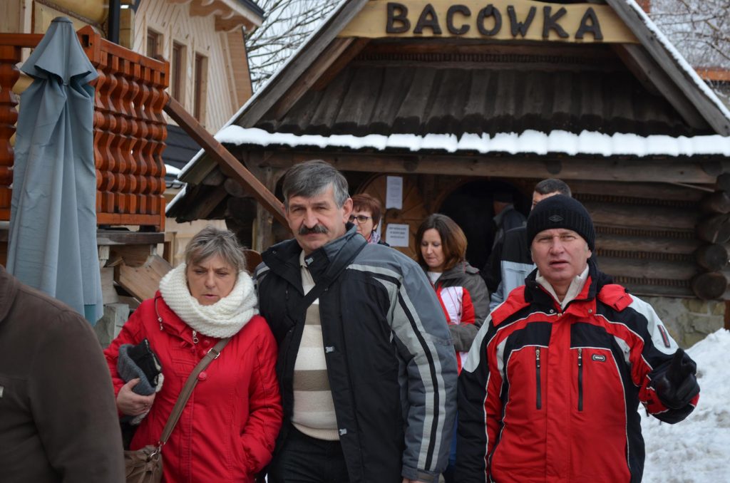 Wyjechaliśmy z miejsca zbiórki o godzinie 13.00 do Koniakowa. Wizyta w Chacie na Szańcach gdzie usłyszeliśmy regionalną opowieść „z przymrużeniem oka” o kulturze/tradycjach i zwyczajach górali Beskidu Śląskiego. Pan, który snuł opowieść okazał się być bardzo wesołym i rozrywkowym człowiekiem, zasypywał nas budzącym gromki śmiech opowiastkami i kawałami. Zwiedziliśmy sklep z regionalnymi pamiątkami (w tym koronki i słynne już stringi wykonane przez koronkarki koniakowskie). Po przyjeździe do Jaworzynki wsiedliśmy na 5 wozów, w które zaprzężone były po 2 koniki i ruszyliśmy w drogę Doliną Czadeczki w Jaworzynce przy styku granic Polski-Czech i Słowacji. Długość Trasy 8 km! Było wesoło. Padał śnieżek. Po powrocie, w bacówce: żurek, kiełbaska z dodatkami, grzane wino, kawa/herbata, chleb ze smalcem i ogórkiem. Zabawa przy muzyce kapeli góralskiej wydawała się nie mieć końca. Jeszcze krótka wizyta w Karczmie „Po Zbóju” w Istebnej. Wróciliśmy zadowoleni i dobrze przewietrzeni górskim powietrzem, w godzinach wieczornych do Bielska-Białej.