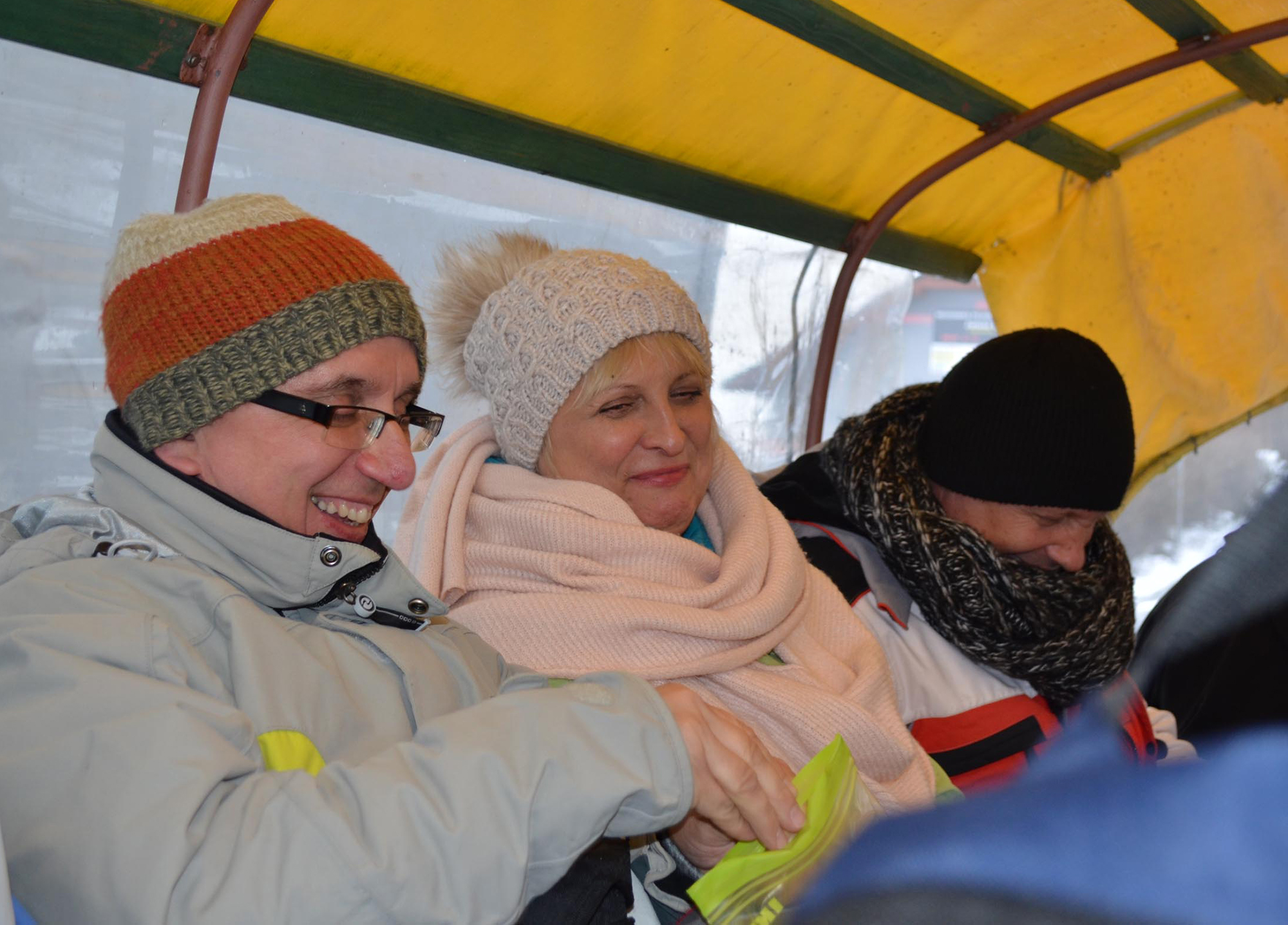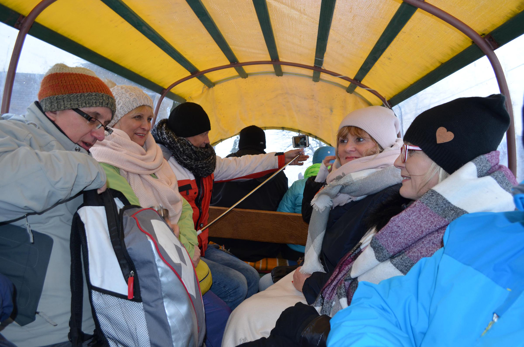 Wyjechaliśmy z miejsca zbiórki o godzinie 13.00 do Koniakowa. Wizyta w Chacie na Szańcach gdzie usłyszeliśmy regionalną opowieść „z przymrużeniem oka” o kulturze/tradycjach i zwyczajach górali Beskidu Śląskiego. Pan, który snuł opowieść okazał się być bardzo wesołym i rozrywkowym człowiekiem, zasypywał nas budzącym gromki śmiech opowiastkami i kawałami. Zwiedziliśmy sklep z regionalnymi pamiątkami (w tym koronki i słynne już stringi wykonane przez koronkarki koniakowskie). Po przyjeździe do Jaworzynki wsiedliśmy na 5 wozów, w które zaprzężone były po 2 koniki i ruszyliśmy w drogę Doliną Czadeczki w Jaworzynce przy styku granic Polski-Czech i Słowacji. Długość Trasy 8 km! Było wesoło. Padał śnieżek. Po powrocie, w bacówce: żurek, kiełbaska z dodatkami, grzane wino, kawa/herbata, chleb ze smalcem i ogórkiem. Zabawa przy muzyce kapeli góralskiej wydawała się nie mieć końca. Jeszcze krótka wizyta w Karczmie „Po Zbóju” w Istebnej. Wróciliśmy zadowoleni i dobrze przewietrzeni górskim powietrzem, w godzinach wieczornych do Bielska-Białej.