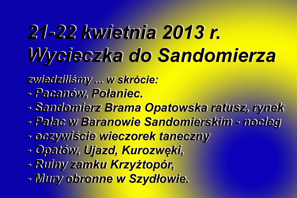W trakcie autokarowej wycieczki, której celem było miasto Sandomierz, zwiedziliśmy klasztor i pustelnię Kamedułów w Rytwianach, podziemia Sandomierza, sandomierski rynek i malownicze uliczki Sandomierza. Po przyjeździe do Baranowa Sandomierskiego, uczestniczyliśmy w uroczystej kolacji połączonej z wieczorkiem tanecznym w salach Pałacu w Baranowie. Niektórzy uczestnicy wycieczki przedłużyli kolację połączoną z pobytem w salach Baranowskiego Pałacu do wczesnych godzin porannych. A było co zwiedzać. W kolejnym dniu naszej wycieczki, wraz z miłą tamtejszą przewodniczką przeszliśmy pozostałe komnaty napawając oczy pięknymi obrazami i bogatym wnętrzem pałacu. Kolejnym celem wycieczki było miasto Opatów z dwunastowieczną romańską Kolegiatą gdzie spędziliśmy czas na zwiedzaniu, słuchając przewodnika. Zakupiliśmy trochę opatowskich krówek na dalszą drogę i ruszyliśmy do miejscowości Ujazd, gdzie czekały na nas ruiny zamku Krzyżtopór z siedemnastego wieku. Kolejną atrakcją wycieczki była wizyta w Kurozwękach, gdzie posililiśmy się iście szlacheckimi daniami, zwiedziliśmy rycerski zamek z czternastego wieku oraz przepiękny park z hodowlą amerykańskich bizonów. Po małym odpoczynku ruszyliśmy w drogę powrotną do Bielska-Białej słuchając w drodze ciekawych opowieści naszej miłej przewodniczki, Pani Jasi. Bardzo serdecznie dziękujemy przede wszystkim, naszym sympatycznym uczestnikom za zdumiewającą wręcz dyscyplinę i zaangażowanie. Dzięki czemu bez trudu mogliśmy zrealizować mocno napięty plan wycieczki. Bardzo, bardzo serdecznie dziękujemy Panu Komendantowi Miejskiemu st.bryg. Adamowi Caputa za pomoc w postaci zadysponowania autokaru wraz z doświadczonym, miłym i uczynnym kierowcą. W przeciwnym wypadku nasza, piesza wtedy wycieczka mogłaby potrwać ok. 3 tygodnie.