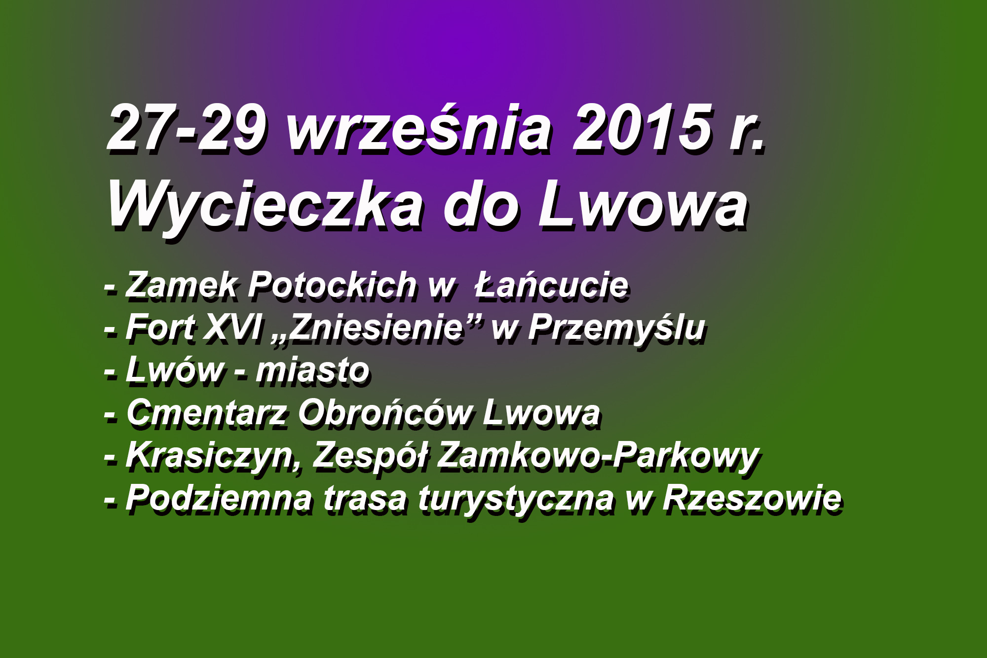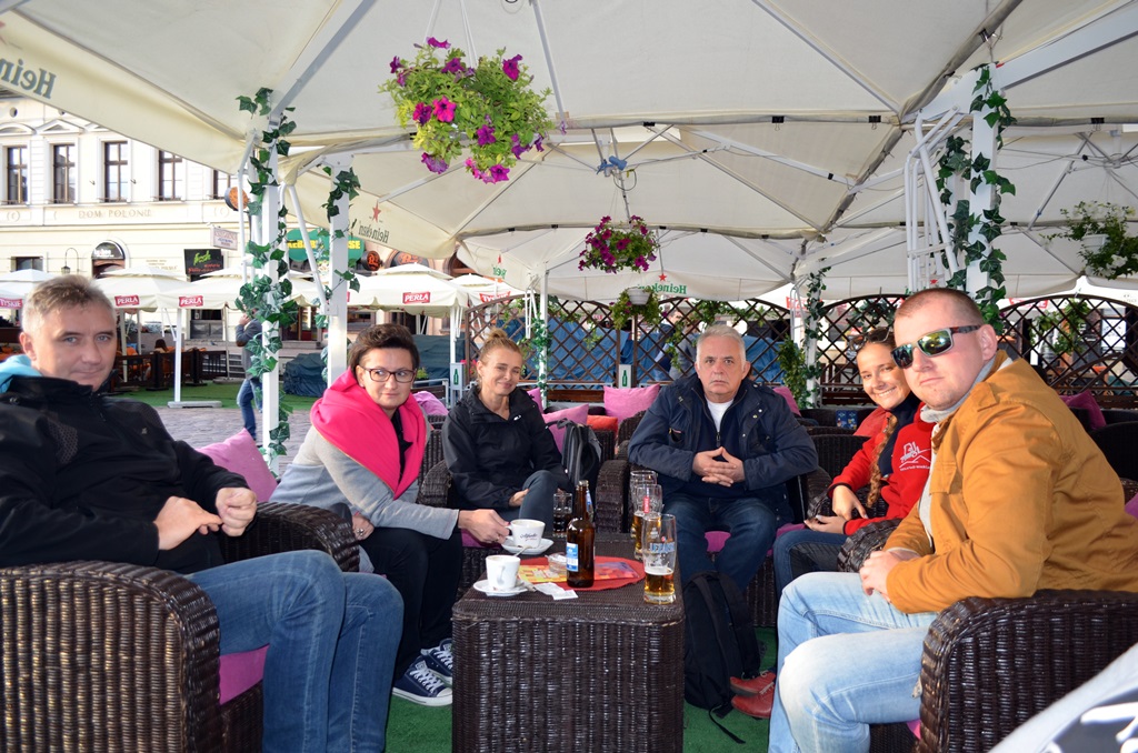 Kolejna udana (27-29 września 2015 trzydniowa) wycieczka zakończona! Trochę smutno. Mimo, że trwała 3 dni, dzięki wspaniałym atrakcjom przemknęła bardzo szybko. Jak zwykle, zdyscyplinowana i punktualna grupa naszych wycieczkowiczów stawiła się na miejsce wyjazdu przy KM PSP w Bielsku-Białej. Wyruszyliśmy punktualnie. Pierwszym obiektem zwiedzania był Zamek Potockich i Wozownia w Łańcucie. Niestety w pomieszczeniach nie wolno nam było fotografować. Bardzo malownicze miejsce warte odwiedzenia. Kolejnym niemniej atrakcyjnym w swej działalności obiektem, który odwiedziliśmy była Fabryka Wódek POLMOS w Łańcucie. Sporo wrażeń, doznań i uniesień podczas zwiedzania, a już na pewno podczas degustacji kilkunastu rodzajów wódek i likierów. Szkoda, że tak krótko… niektórzy z pewnością pozostaliby nieco dłużej. Jednak czas nas trochę poganiał. Dotarliśmy do Przemyśla i tam następnym obiektem do zwiedzenia była „Twierdza Przemyśl” Fort Zniesienie usytuowany na wzniesieniu, z którego rozciągał się widok na miasto Przemyśl. Na pierwszy dzień to koniec zwiedzania. Zostaliśmy zakwaterowani w Hotelu Gloria i po posiłku korzystaliśmy z basenu i SPA w tymże hotelu. Rano, po obfitym hotelowym śniadaniu przekroczyliśmy granicę polsko-ukraińską w Medyce. Dotarliśmy do Lwowa. To piękne miasto jednak nieco zatłoczone i zapchane pojazdami, zarówno samochodowymi, jak i szynowymi. Ze wzgórza obok ruin Wysokiego Zamku rozpościera się wspaniały widok na cały Lwów. Bardzo zajmująco opowiadał o Lwowie nasz ukraiński przewodnik, który dosiadł się do nas w między czasie. Kolejnym punktem naszego programu był Cmentarz Obrońców Lwowa, gdzie złożyliśmy wieniec pod pomnikiem Orląt Lwowskich. Pod koniec dnia przejechaliśmy do Hotelu Mirage, gdzie zostaliśmy zakwaterowani. Wieczorem podczas uroczystej obiadokolacji przygrywał nam trzyosobowy, ukraiński zespół muzyczny. Wbrew obaw, dobrze znali słowa polskich wykonawców muzycznych i grali naprawdę świetnie. Uczestnicy naszej wycieczki, mimo zmęczenia, korzystali z parkietu sali balowej do późnych godzin wieczornych. Rano, po sytym śniadaniu udaliśmy się w stronę granicy. Oczekiwanie na przejście zajęło nam blisko 2 godziny. Po stronie polskiej zatrzymaliśmy się w Krasiczynie, by zwiedzić tamtejszy Zespół Zamkowo – Parkowy. Pogoda dopisywała jak dotąd. Dotarliśmy do Rzeszowa, gdzie po spożyciu obiadu udaliśmy się do podziemnej trasy turystycznej, którą przebyliśmy wraz z przewodnikiem. Pospacerowaliśmy troszkę po malowniczym Rzeszowskim rynku i o zmroku ruszyliśmy w podróż powrotną do Bielska-Białej.