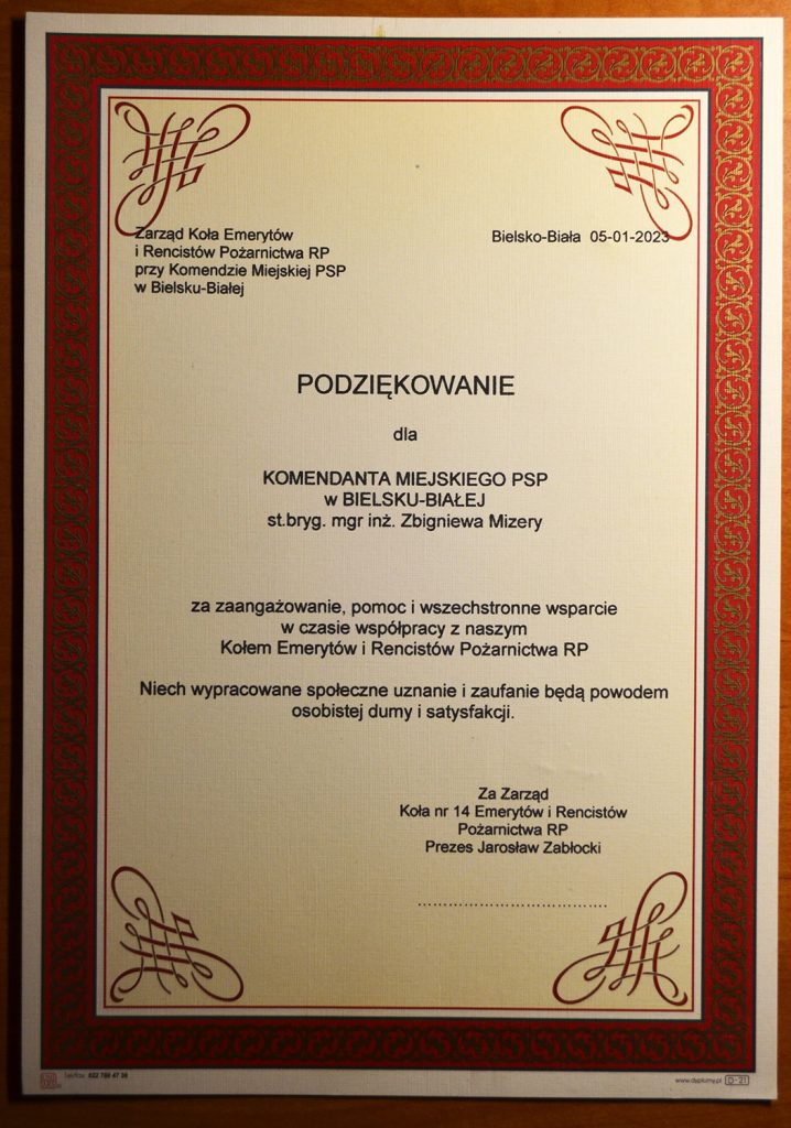 Prezes Koła Jarosław Zabłocki przedstawił dokonania zrealizowane w minionej kadencji za lata 2019 do 2022 oraz program, który będzie realizowany w roku 2023, poinformował o powiększeniu stanu naszego koła do 138 członków na koniec roku 2022. Prezes Jarosław Zabłocki wręczył Komendantowi Miejskiemu PSP Zbigniewowi  Mizerze PODZIĘKOWANIE za zaangażowanie, pomoc i wszechstronne wsparcie dla naszego Koła.